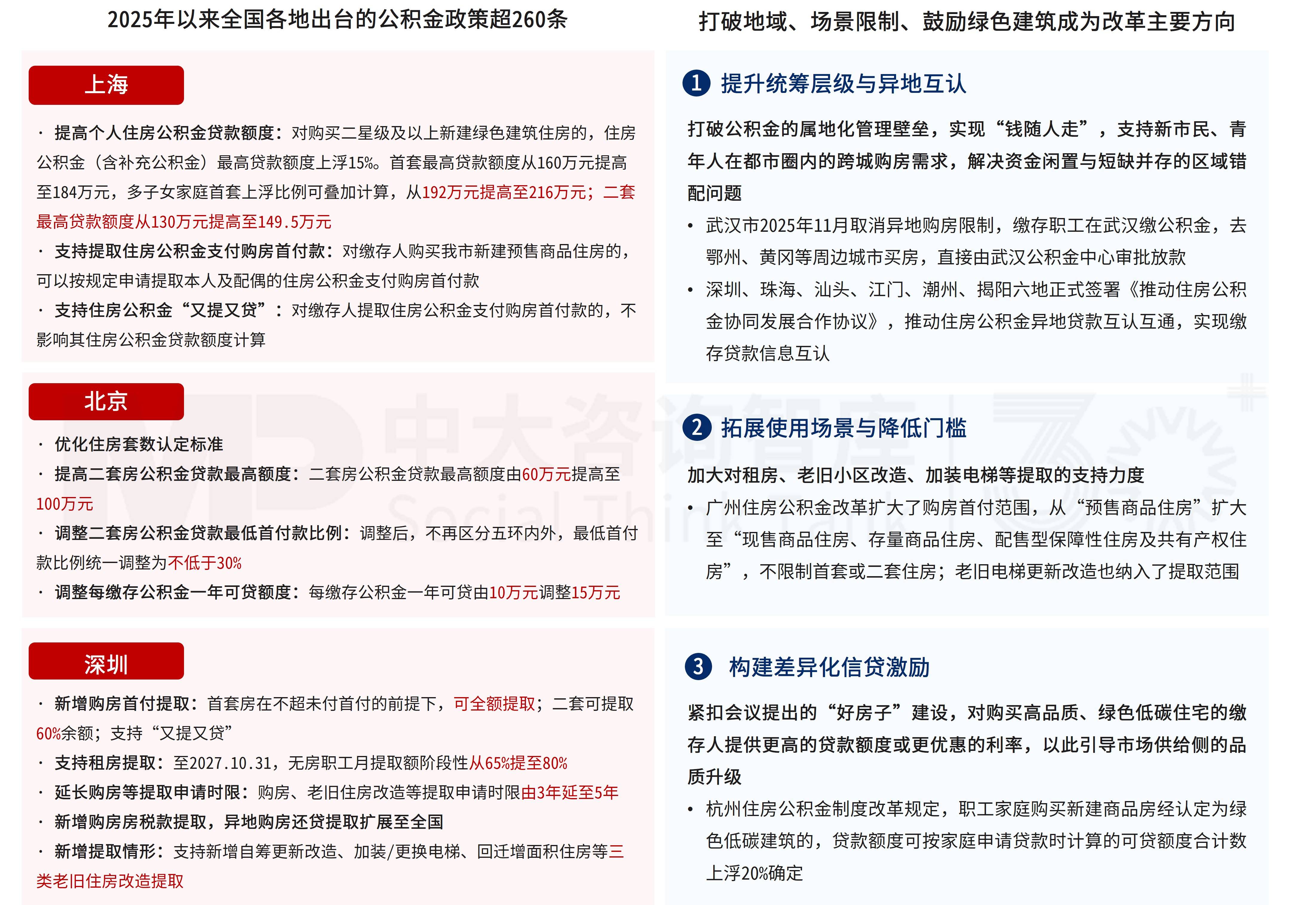 在房地产方面,今年房地产销售降幅同比收窄,全国商品房待售面积连续九个月下降,但还需要进一步稳定房地产市场。2026年,房地产政策侧重通过政策、制度加快构建房地产发展新模式,主要体现为三点:一是因城施策调控政策进一步放松,比如进一步放开限购限售、购房契税优惠等;二是明确指出鼓励收购存量商品房重点用于保障性住房,地方政府通过专项债、保障性住房再贷款等多种形式收购存量房,因城施策去库存,通过收购存量,尽快降低库存;三是深化住房公积金制度改革,推动住房公积金打破属地化管理壁垒、拓展使用场景,有序推动“好房子”建设。