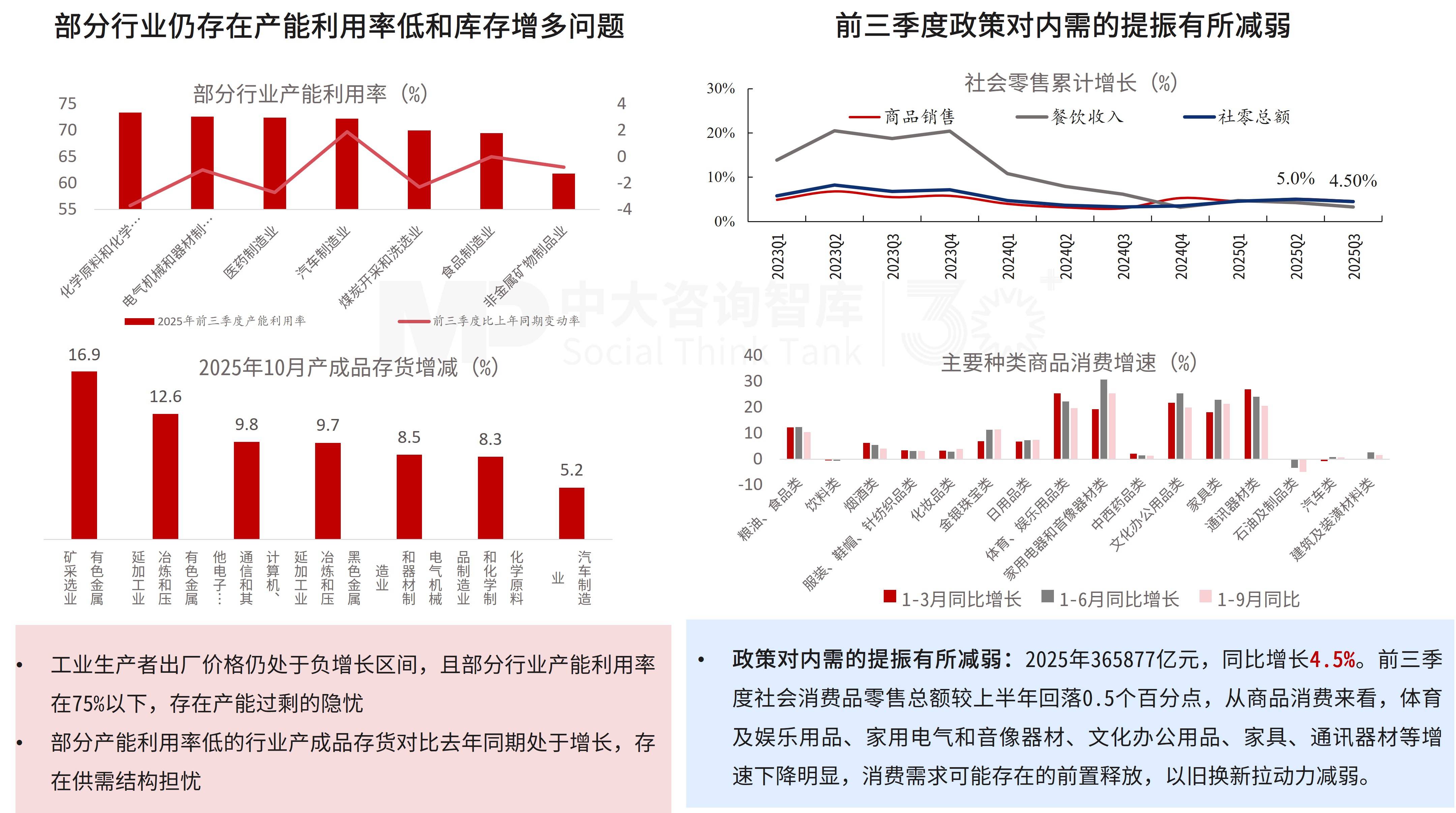 国内供强需弱矛盾突出。供给端和需求端结构性失衡。一方面,低端同质化产品“内卷式”竞争加剧产能利用率低的问题,但高端供给、优质供给严重不足,难以匹配居民消费需求。2025年前三季度,部分行业产能利用率在75%以下,其中,食品制造业和非金属矿物制品业的产能利用率分别仅为69.5%和61.7%。另一方面,需求端居民消费受增收预期、消费限制、商品和服务消费供给质量等影响,增长动能不足。尽管在以旧换新政策的支持下,上半年内需有所提振,但前三季度社会消费品零售总额较上半年回落0.5个百分点,体育及娱乐用品、家用电器和音像器材、文化办公用品、家具、通讯器材等商品消费增速明显下降,消费需求可能存在前置释放,还需要进一步扩大内需。