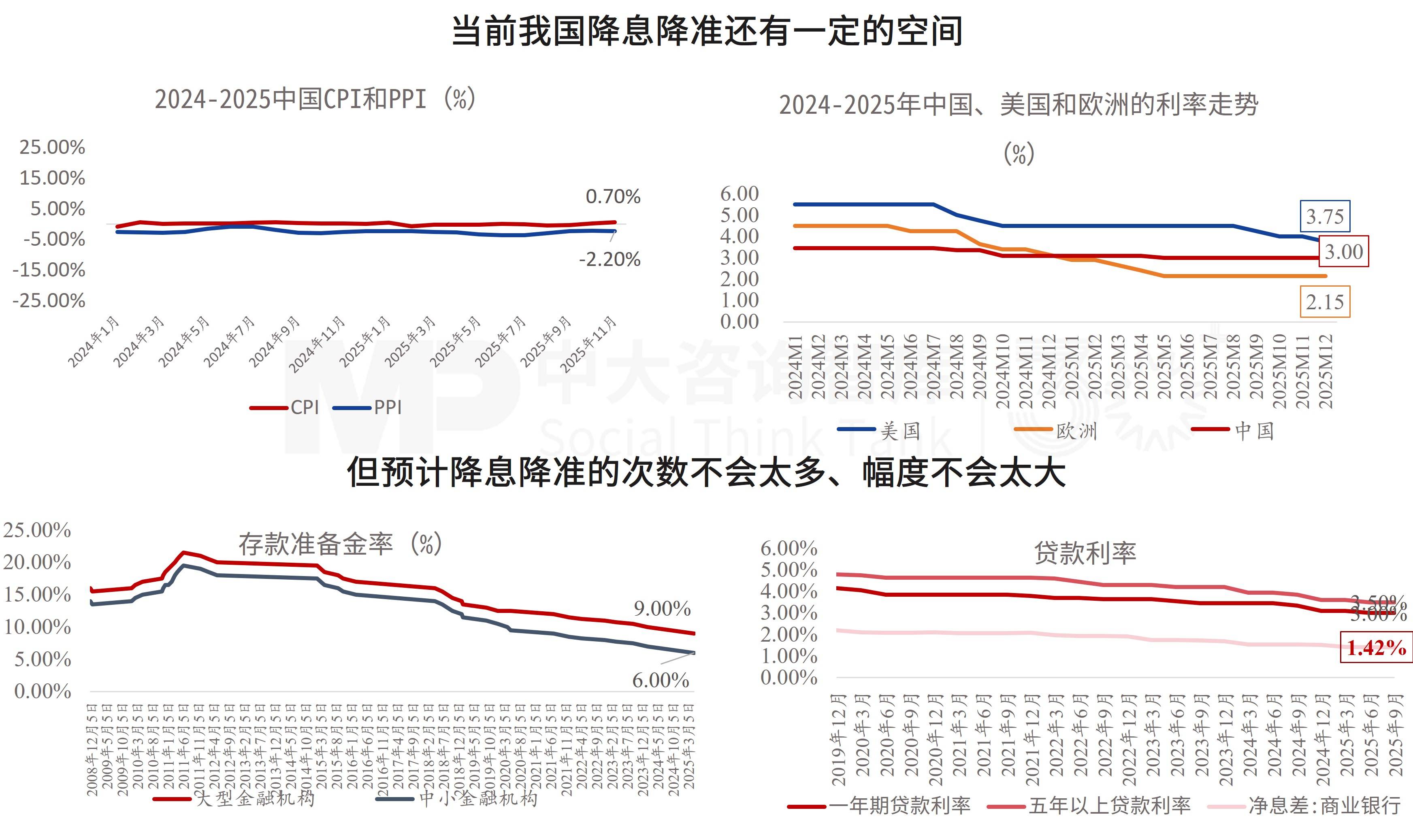 2. 适度宽松的货币政策:2025年延续了适当宽松的货币政策的提法,旨在为经济稳定增长和高质量发展营造良好的货币金融环境。而发挥好货币政策工具总量和结构双重功能,其中最受到关注的的是适时降准降息。会议提出灵活高效运用降准降息等政策工具,保持流动性充裕,结合当前欧美经济体降息预期升温的外部环境,从政策操作空间研判,未来一年内我国利率预计会有小幅调整。