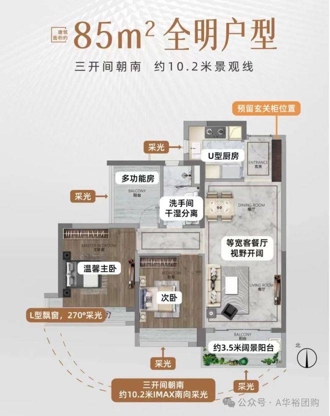 户型设计走高实用性路线㎡一线湖景平层,三开间朝南,客厅开间宽敞,U型厨房动线米大阳台可打造成空中花园。118㎡纯南向户型南北对流,主卧带独立卫浴,私密性强。复式111㎡、121㎡、135㎡双层空间,百变人生,灵动设计实现阔绰视野,一层一世界。户型全部南向,南北通透,采光通风优秀,使用率高,飘窗、阳台放大室内尺度,实际居住感超出预期。客厅通透大气,阳台视野开阔,主卧尺度合适,日常做饭、聚会、带娃都特别舒服。