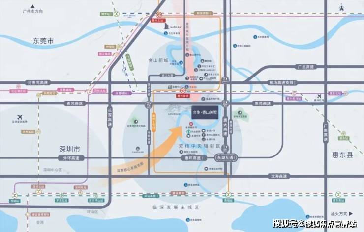 三轨道:即广汕高铁、深惠城轨、惠州地铁1号线,都汇集于惠城南站(已更名为惠州南站),离我们项目约8公里,10分钟车程。